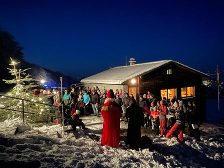 Der Nikolaus und sein Knecht Ruprecht besuchten uns, natürlich auf Skiern, vor der Skihütte und wurden von Jung und Alt empfangen.